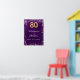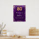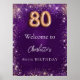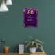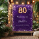 Un poster de bienvenida para una fiesta de cumpleaños número 80, glamurosa y femenina. Un fondo violeta profundo decorado con chispas falsas. El color púrpura es desigual. Personalizar y un nombre.