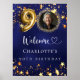 Un poster de bienvenida para una fiesta de cumpleaños número 90. Un fondo azul marino con elegantes estrellas de oro fino. El color azul es desigual. Personalice y agregue una foto, nombre y texto. Letras blancas.