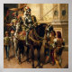 Los caballeros medievales con brillantes armaduras están montados a caballo, sosteniendo carriles y usando cascos desplumados. El entorno parece ser una gran sala o un patio adornado con detalles y pancartas muy complejas. Este cuadro es "To the Joust" de Cesare Detti.