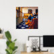 “A Lady at the Virginals with a Gentleman” by Johannes Vermeer captures a quiet moment of music and conversation inside a sunlit Dutch interior. Soft daylight filters through leaded windows, revealing rich textures in the tiled floor, the patterned tablecloth, and the polished wood of the virginals. A young woman stands at the instrument as a gentleman leans nearby, their poised gestures suggesting both courtship and etiquette. Vermeer’s calm composition and luminous color create a scene that feels intimate, elegant, and timeless, perfect for adding a refined touch to any space.