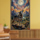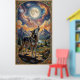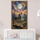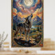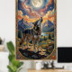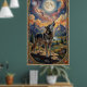 A lone wolf full size howls at a moon rising over a serene, undiscovered mountain range. The sky is filled with vibrant cosmic dust and nebulae, creating a celestial spectacle. The scene is captured with the depth and drama of a cinematic film still, infused with the rich textures of smooth post-impressionist impasto acrylic painting and the decorative elegance of Art Nouveau.