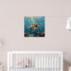 A sea turtle themed wall art with an illustration of a sea turtle under a calm teal sea swimming among the coral on the ocean floor with sun rays beaming down on him through the aqua water.