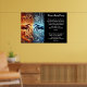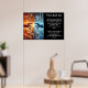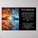 Un abrazo elemental se representa en esta representación artística de dos manos, fuego y hielo. La mano azul glacial, girando con heladas y músculos, representa frialdad y claridad. El intenso naranja y la mano roja, que se agitan con llamas y humo, representan calor y pasión. El fondo es una mezcla degradada de tonos oscuros y ahumados que resaltan el contraste. Los efectos de luz resaltan el tema elemental. "Fuego y hielo" está en la cima de la tipografía audaz y moderna.