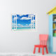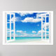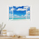 Hermosa reproducción de pincel acuático del agua azul cristalina e igualmente brillantes cielos azules por la ventana abierta en su villa de vacaciones en la playa.