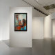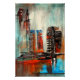 Abstract cityscape with tall, colorful skyscrapers evokes a sense of urban dynamism. The blend of blues, reds, and oranges creates a vibrant atmosphere.