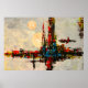 A vibrant cityscape is portrayed with bold, abstract strokes in red, blue, and yellow against a muted gray background. Two large, glowing moons add a surreal, otherworldly atmosphere to the scene.