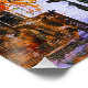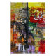 A colorful abstract representation of a cityscape with geometric shapes and bold colors. The composition features a mix of structured and chaotic elements