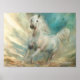 Across The Windswept Sky is from the 'Horse' series of original equine art by Carol Cavalaris. Legend tells of a wild mare with hair the colors of the moon. Some say she is a white shadow made of clouds and memories, searching for her lost mate. But no one really knows where she came from or where she goes. Or why she races across the windswept sky. This painting of a lovely white mare running across a windy sky of white, cream, and aqua blue clouds, makes a stunning art poster or print for any decor.  Design is also available as an artcard, mug, mousepad, and other items.
