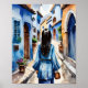 Esta impresión de arte muestra un retrato acuarela de una mujer caminando por un callejón a través de Chefchaouen, Marruecos.