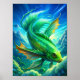 En la imagen, un vibrante pez verde nada con gracia a través de un brillante cielo azul, desafiando las leyes de la naturaleza. Las escalas de los peces brillan a la luz del sol, reflejando los tonos de esmeralda y lima. Sus aletas se extienden a lo ancho, creando una sensación de movimiento y elegancia a medida que se desliza por el aire. Las nubes blancas onduladas se desprenden del fondo, lo que realza el ambiente surrealista de la escena. La combinación de los peces y el cielo crea una imagen caprichosa y encantadora, invitando a los espectadores a imaginar un mundo donde todo sea posible.