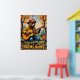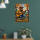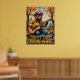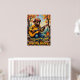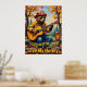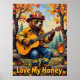 Esta encantadora obra de arte cuenta con un oso vestido de bombero, con casco y gafas de sol, que toca una guitarra acústica mientras se sienta en una rústica valla de madera. Cerca hay un frasco de miel. El fondo muestra hojas de otoño coloridas sobre los árboles y diseminadas por el suelo, creando un ambiente de caída vibrante. El cuadro utiliza pinceladas gruesas y texturadas, que le dan un aire caprichoso y reconfortante, con "Amar a mi miel" escrito a continuación.