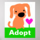 Poster especial para la adopción de mascotas. Perro naranja con flor de corazón rosa y el trabajo Adopta abajo.