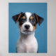 Un fascinante retrato de primer plano de un cachorro Jack Russell Terrier con un abrigo negro, blanco y marrón, mirando directamente a la cámara con ojos azules grandes y conmovedores. Las orejas del cachorro están ligeramente tapadas, y su curiosa expresión está puesta sobre un suave fondo azul, resaltando sus características lindas e inocentes.
