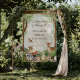 A charming woodland welcome poster featuring the phrase “Adventure Awaits” surrounded by soft watercolor trees and adorable forest animals. The deer, squirrel, raccoon, bunny, hedgehog, and bird create a sweet storybook scene that feels warm, rustic, and inviting. Gentle greenery and natural earth tones make this design a beautiful fit for a gender-neutral baby shower or nature-inspired celebration. A lovely poster for greeting guests and completing your woodland party decor.