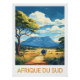 Affiche artistique de l’Afrique du Sud représentant une savane animée avec éléphants, zèbres, arbres typiques et montagnes en arrière-plan. Une décoration murale vibrante pour évoquer la richesse de la faune et des paysages africains.