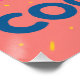 L’affiche explose de motifs et de couleurs. Un grand verre de cocktail stylisé, en zigzag et en aplats, trône au centre sur un fond rose électrique parsemé de formes aléatoires : triangles turquoise, confettis jaunes, éclairs noirs. Des pailles torsadées sortent du verre, et des tranches de citron sont dessinées en surimpression. Des motifs de grille, de vagues et de points créent un chaos contrôlé typique du style Memphis. Le mot « Cocktails » est inscrit en lettres rondes, naïves, en bas, dans une couleur bleu vif.