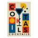 L’affiche s’organise autour de formes géométriques strictes : carrés, cercles et lignes disposés en une composition asymétrique mais équilibrée. Le mot « Cocktails » est déconstruit typographiquement, chaque lettre occupant sa propre zone colorée. Des formes évoquant des verres stylisés, des pailles et des bulles sont intégrées aux blocs colorés. La palette rouge primaire, jaune vif, bleu cobalt, noir et blanc. Le fond est blanc cassé pour faire ressortir l'intensité graphique des couleurs pures.