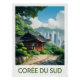 Affiche illustrée de la Corée du Sud montrant une maison traditionnelle hanok au cœur de la verdure, avec une vue sur les gratte-ciel modernes de Séoul. Une décoration murale parfaite pour symboliser l’harmonie entre tradition et modernité.