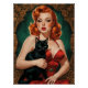 Apportez une touche de glamour rétro et de mystère à votre décoration avec cette magnifique illustration d'une pin-up rousse en robe rouge, tenant un chat noir. Son regard captivant et son style inspiré des années 50 rappellent l'élégance intemporelle du vintage. Encadrée par un décor orné et raffiné, cette œuvre évoque une atmosphère à la fois envoûtante et sophistiquée. Idéale pour les amateurs d'art rétro, de chats et d’esthétique élégante et mystique !