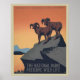 Afiche de época para el Servicio de Parques Nacionales que promueve el viaje a parques nacionales, mostrando dos ovejas de bighorn, alrededor de 1936
