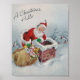 Escena vintage de Santa y su bolso de juguetes en un techo listo para bajar por la chimenea...el texto lee A Navidades Hola poster.