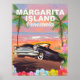 Venezuela, el afiche de viaje de estilo vintage de la isla Margarita con un hermoso auto clásico antiguo en la playa.