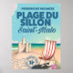 Saint-Malo, poster francés de vacaciones con un castillo de arena y una tumbona. poster francés de vacaciones vintage.