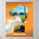 Impresión de afiches de viaje de locomotora de motor de vapor en el mapa de Zimbabue.