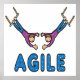 Agile design muestra a artistas trapecio sobre la palabra Agile creando un divertido gráfico para gurús ágiles, maestros de matorral y equipos de proyectos.