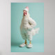 Pollo caprichoso y antropomórfico vestido con un traje blanco esponjoso, zapatillas acogedoras y una abeja. Con una postura segura y un suave fondo pastel, este carácter surrealista combina el humor y la creatividad, creando una imagen única y atractiva para un amante del pollo o una Pascua