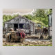 Un original y divertido diseño abstracto de la granja con graneros, vacas, caballos y equipo.