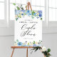Hidrángulos Azules de color de agua Las Parejas Duermen Señal De Bienvenida. Parejas florales brillantes y elegantes de ducha de bienvenida con higaduras de color azul y púrpura, peonías, anémonas y follaje. Este cartel de bienvenida con flores es perfecto para eventos de primavera y verano.
