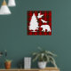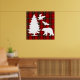 Un diseño elegante para el invierno con fondo rojo, negro, verde tartán y animales y árboles del bosque.