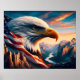 Una impresionante representación artística de un águila calva, con su cabeza que se funde perfectamente en las estrellas y rayas de la bandera estadounidense, ambientada en un telón de fondo de montañas imponentes y un sereno valle del río bañado en el cálido resplandor del amanecer.
