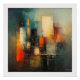 Este diseño abstracto es vibrante y dinámico, caracterizado por una rica interacción de colores, texturas y formas geométricas. El arte presenta un fuerte sentido de verticalidad y horizontalidad, lo que sugiere un paisaje urbano abstracto o estructuras arquitectónicas. Los grandes bloques de color rectangulares, especialmente los de color blanco, amarillo pálido y oscuro, crean una sensación de profundidad y dimensión. Estos bloques están intersectados y superpuestos por numerosas líneas finas, raspadas o grabadas, formando un patrón de cuadrícula que se añade al ambiente urbano o estructural. El diseño evoca una sensación de energía urbana bulliciosa, tal vez una ciudad por la noche o una interpretación vibrante y abstracta de la arquitectura moderna. Los espacios luminosos se iluminan con el fondo más oscuro, dando la impresión de ventanas iluminadas o luces distantes dentro de una estructura compleja.