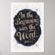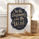 Inspira la fe y la reflexión con esta elegante impresión artística que presenta las profundas palabras de Juan 1:1. La hermosa caligrafía dorada sobre un fondo de azul profundo y acentos estrellados crea un diseño visualmente impactante y espiritualmente edificante. Perfecto para agregar un toque de elegancia e inspiración a la decoración de tu hogar u oficina.