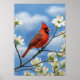 Un vibrante cardenal rojo del norte se sienta en la rama de un árbol de madera de perro, rodeado de delicadas flores blancas. El cielo azul ofrece un maravilloso contraste a esta imagen, y el aspecto de pintura al óleo le añade un toque extra a esta impresionante imagen.