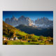 Impresión poster del pueblo de St. Magdalena con su iglesia en el Villnoesstal en el Tirol del Sur, Italia, durante la temporada de otoño con las montañas Geisler Dolomitas como telón de fondo.