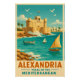Afiche de viajes retro de Alejandría, Egipto. Pieza de centro: la costa mediterránea con olas que se estrellan contra la costa, con la moderna ciudadela de Qaitbay construida en el lugar del antiguo Faro de Alejandría. En primer plano: pequeños barcos de pesca y tradicionales velas de felucca flotando en el agua turquesa.