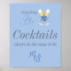 Elegante caligrafía Guión "Algo azul antes de que lo haga" Bridal Ducha Temática Bar Cocktails Rótulo Poster con copas de color agua de champán con un ramo.