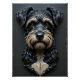 Una baldosa de relieve de cerámica muy detallada que representa un retrato de cabeza y hombros de un perro escrupuloso de mezcla de terrores. El perro mira directamente hacia afuera con los ojos vidriosos de color cálido y brillante, que transmiten una emoción parecida a la vida. Su piel blanca está meticulosamente esculpida en tiras y grumos, y luego se termina con vidrios en capas: negro brillante profundo para el abrigo, blanco plateado para las cejas expresivas y los resaltados, y beige satinado suave para el bozal, la barba y el parche en el pecho. La nariz se representa en un cristal de alto brillo y aspecto húmedo para el realismo. El retrato, situado sobre un fondo cerámico oscuro y con vidrieras mate, destaca con una claridad sorprendente. La iluminación uniforme hace hincapié en las texturas dimensionales y la artesanía experta en el acristalamiento, creando una representación vívida en forma de cerámica.