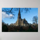 A high-resolution view of the Grade II listed All Saints Church in Salterhebble, West Yorkshire. The image captures the church’s impressive Gothic Revival spire and detailed stonework from the perspective of the historic graveyard. Framed by silhouetted tree branches against a crisp blue sky, the late afternoon sun illuminates the weathered textures of the sandstone, highlighting the architectural heritage of the Calderdale region.