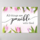 Typography design with caption in white letters, "All Things are Possible With God .” Design is centered inside colorful tulip photography border. Bible verse is from Matthew 19:26.