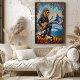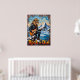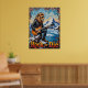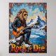 Esta dinámica obra de arte presenta a un león, luciendo gafas de sol geniales y una chaqueta de cuero, tocando intensamente una guitarra eléctrica mientras se agazapa en una montaña nevada. Abajo, un lago azul sereno es visible, flanqueado por pinos y picos distantes. Los trazos gruesos y texturizados de la pintura dan un sentimiento crudo y enérgico a la nieve y el agua, transmitiendo poderosamente el espíritu de "Rock or Die" de este intérprete único.