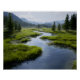 Escape into pure mountain serenity with this breathtaking alpine landscape: a crystal-clear stream winds gently through vibrant green meadows and grassy banks, framed by tall evergreen trees and crowned by majestic, snow-dusted peaks under a soft blue sky. The fresh, tranquil scene radiates peace, renewal, and the untouched beauty of high-altitude wilderness—perfect for nature lovers, meditation spaces, cabins, offices, bedrooms, or as inspiring gifts for hikers, travelers, and anyone who finds calm in the mountains.