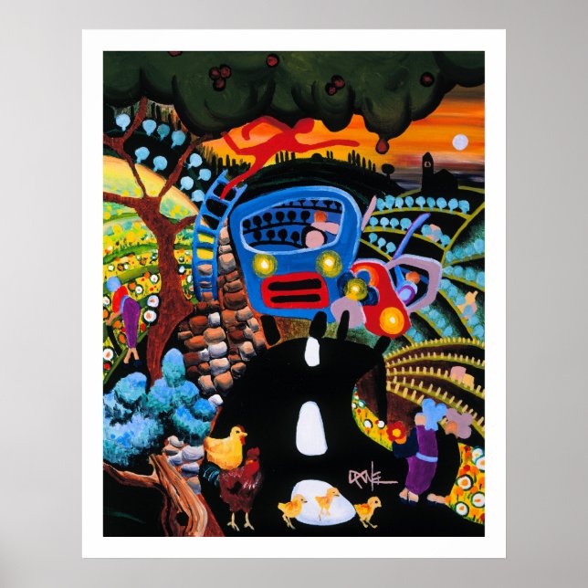 El autobús de Alterini pasa por las colinas toscanas a las afueras de Florencia, Italia. De una pintura al óleo original de un artista californiano, Daniel Berkeland.