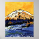 Una pintura del monte Rainier con una puesta de sol amarillo brillante.