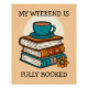 Diseño de poster caprichoso para los amantes de la lectura y de la lectura. Un ilustracion de un acogedor montón de libros con una taza de café equilibrada en la parte superior. Los colores son azul, rojo y naranjas. Encima y debajo de la imagen están las palabras 'Mi fin de semana está lleno' en texto negro. Estas son plantillas para que añadas tus propias palabras si deseas cambiarlas.