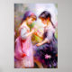 Una pintura generada por IA de dos amigas admirando flores en un jardín. Sería un hermoso decorado para guardería.