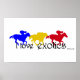El diseño colorido representa una trifecta de caballos corriendo hasta el final.